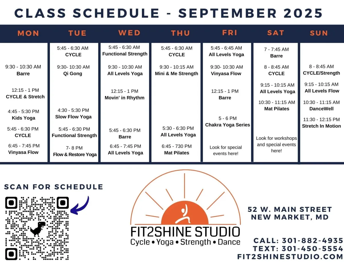 Fit2Shine Studio is all about full body, mind, and spirit wellness. We are committed to offering a variety of classes across each of our movement modalities - CYCLE | YOGA | STRENGTH | DANCE - for all levels, ages, and needs. Whether you are a beginner or advanced, male or female, young or old(er), an athlete or a mom (or both), you will find something here at Fit2Shine Studio for you. We use MINDBODY as our registration platform and there are many ways you can find our schedule below. If you have any questions, don’t hesitate to ask!